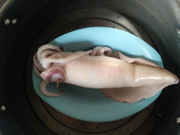 3.Ambil cumi, masukkan isian sambil ditekan-tekan kebawah agar cumi terisi, jangan isi sampai penuh, sisakan 1 cm yang lalu letakkan kepala cumi diatasnya, sambil ditekuk lalu pasang semuat tusuk gigi agar tidak dilepaskan.