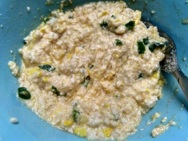2. Isian: hancurkan tahu dengan daging, lalu tambahkan telur, garam, merica, bawang putih dan daun bawang, aduk rata, sisihkan.