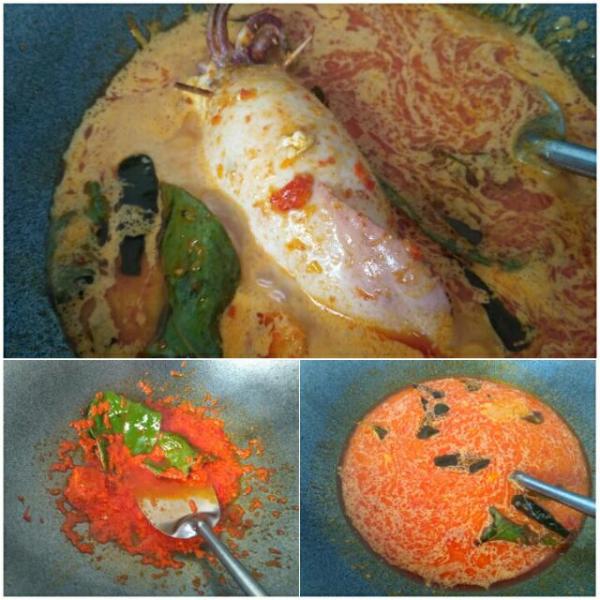 5. Tumis bumbu yang dihaluskan sampai wangi lalu masukkan daun salam, daun jeruk, lengkuas, kaldu bubuk, gula merah, garam, gula pasir dan santan matang sampai mendidih. Koreksi rasa.Lalu masukkan cumi, masak sampai kuah agak mengental. Angkat. Biarkan cumi agak hangat atau dingin. (lebih mudah memotong cumi disaat dingin)